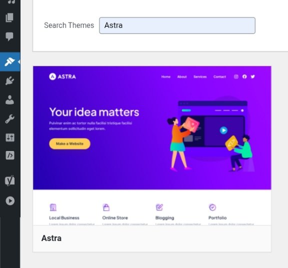 First, go to the search box and type the theme name (e.g., “Astra”). Next, when the theme appears, hover over it and click “Preview” to see how it looks. Then, click “Install” and wait about 10–30 seconds for the installation to complete. Finally, click “Activate.”